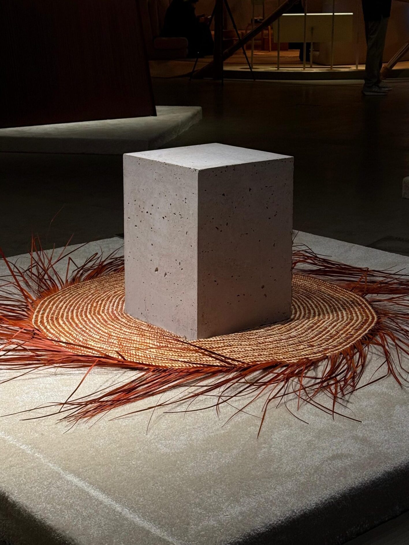Emtidad is a functional coffee table that merges traditional Emirati khoos weaving with a sustainable, low carbon material like Dunecrete. It reimagines the Surood mat, around which Emirati families once gathered, into a contemporary design object. The core concept lies in expressing the continuity of craft through contrast, where the softness of palm weaving flows from the rigidity of Dunecrete, symbolizing the ongoing dialogue between heritage and modernity.