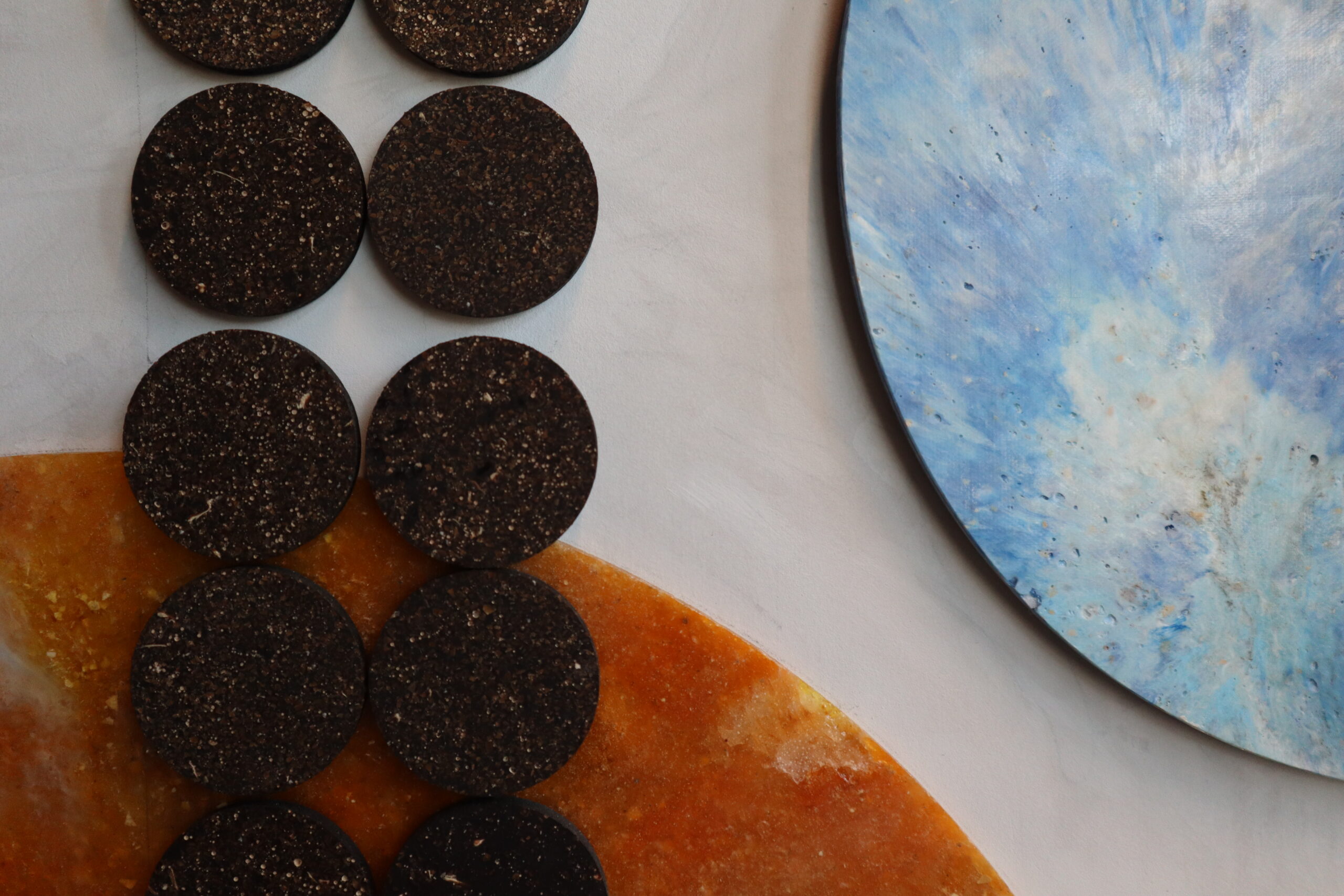At its core, the installation featured a mural crafted from UAE-made materials, accompanied by an exhibition of Colab’s materials collection, showcasing each material’s origins, process, research, and development. The display included unprocessed materials such as date seeds, palm biomass, dried pods, and construction waste, underscoring the often-overlooked local resources and illustrating their transformation into functional, commercially viable sustainable materials. This layered installation provided insight into the creative use of repurposed resources, aiming to inform and engage visitors on the role of materials in responsible design.