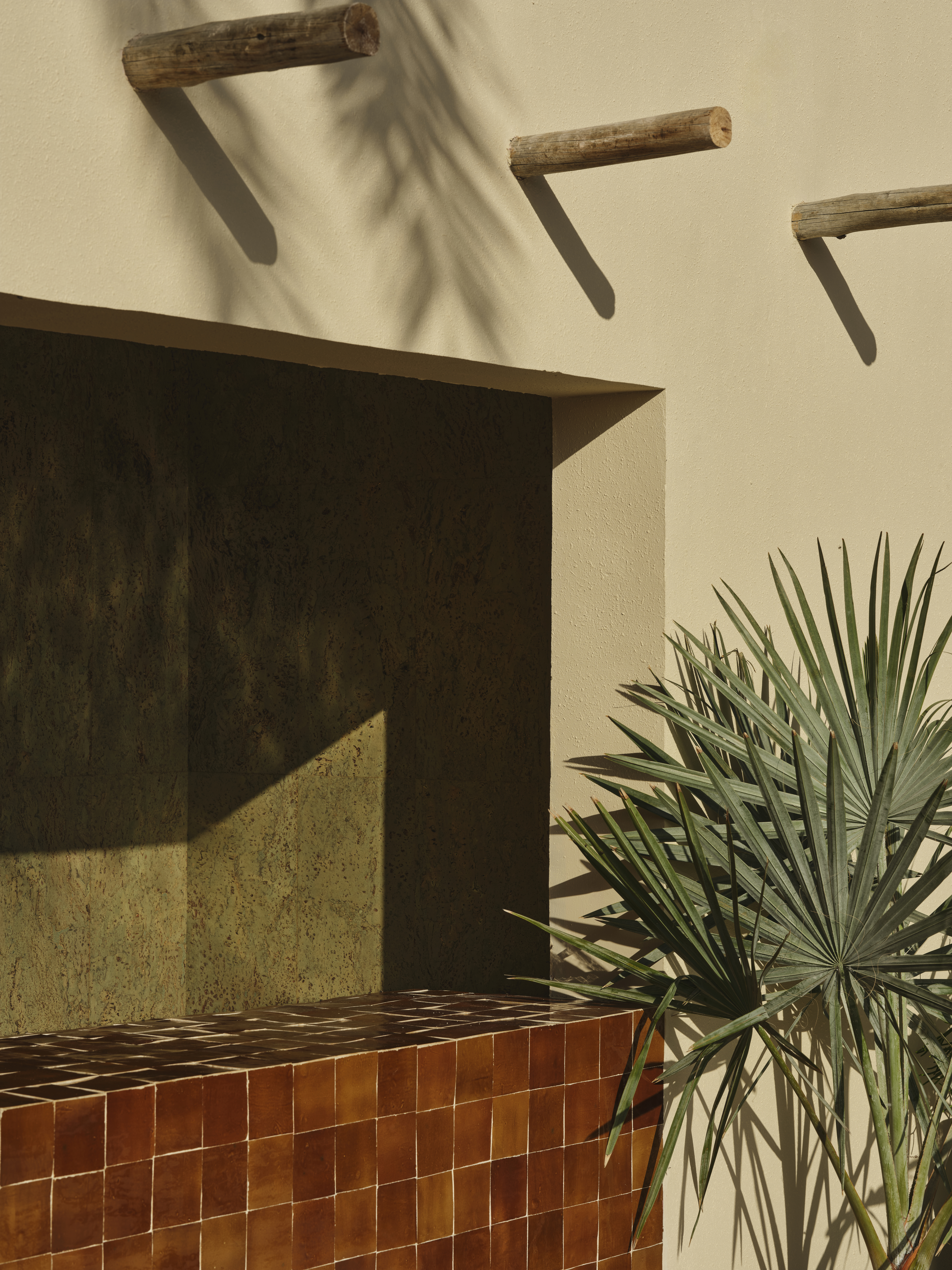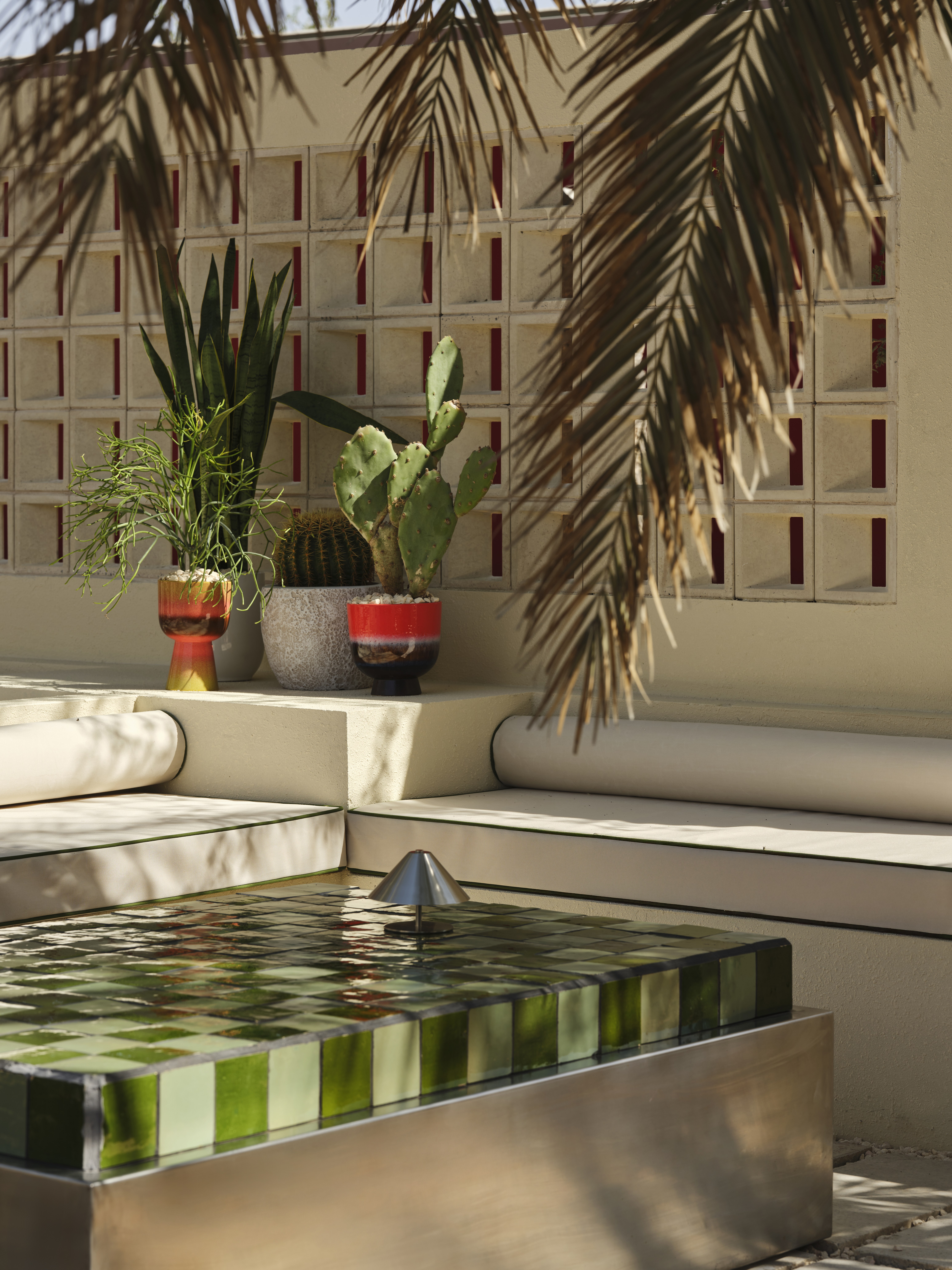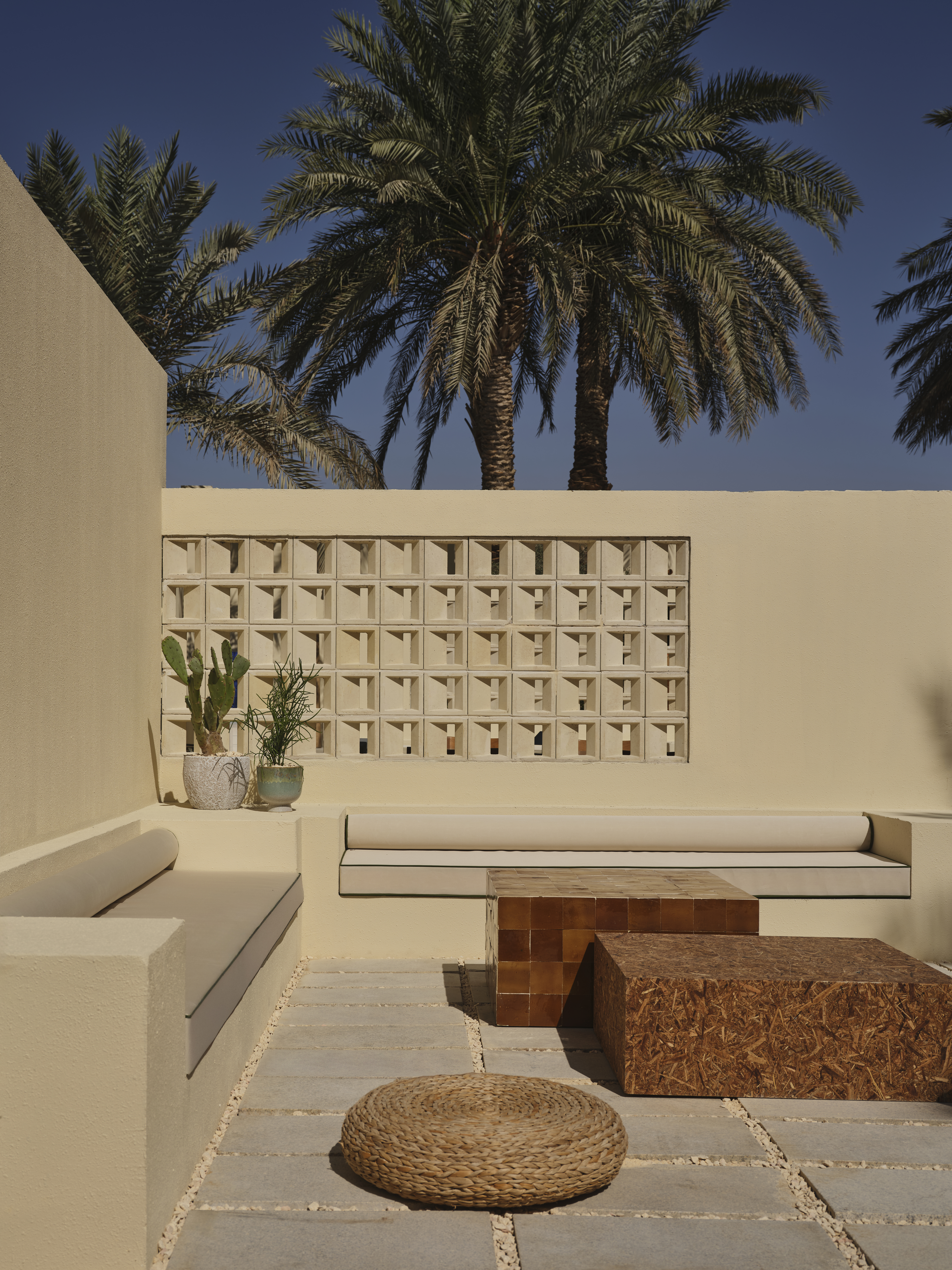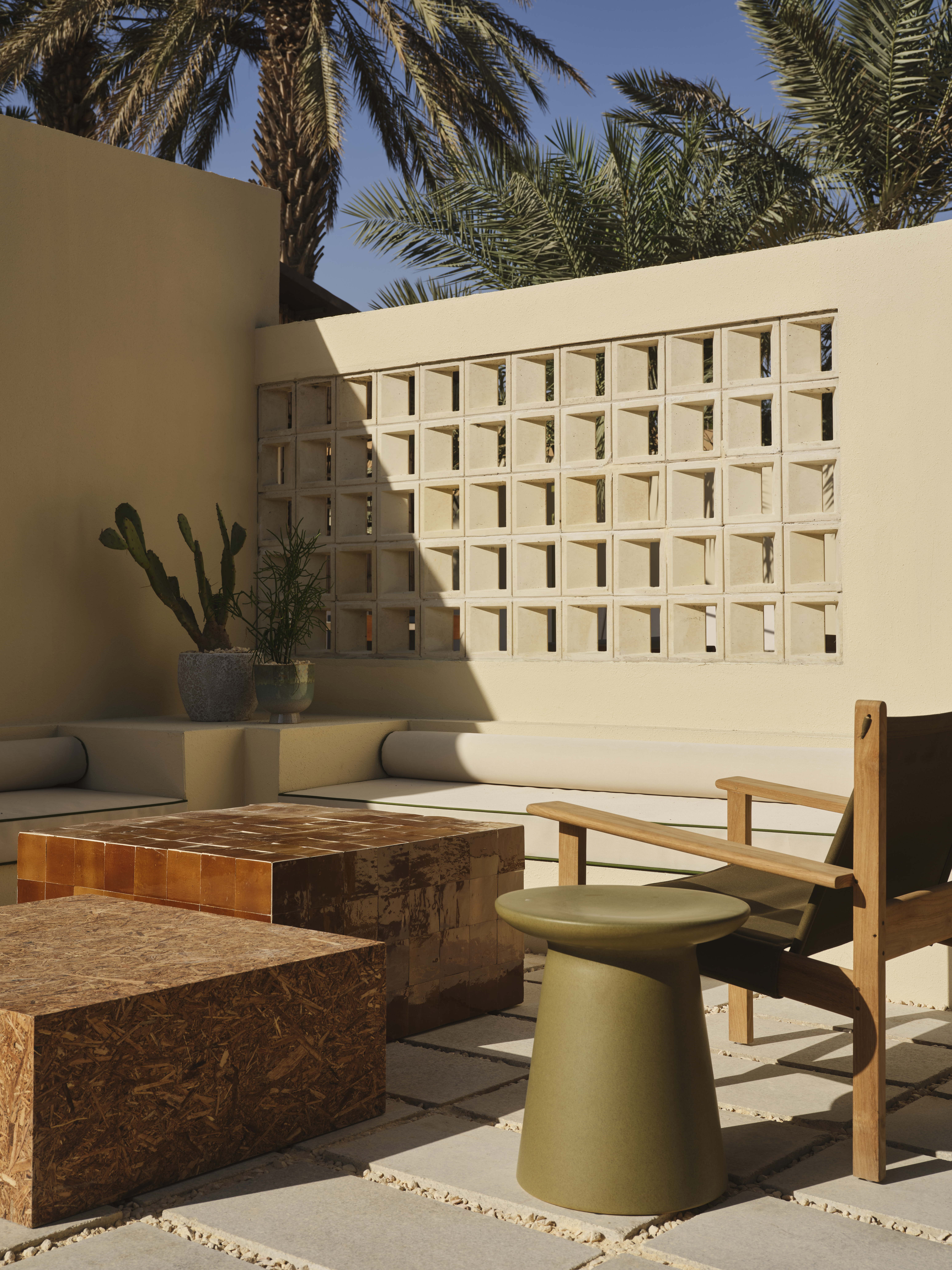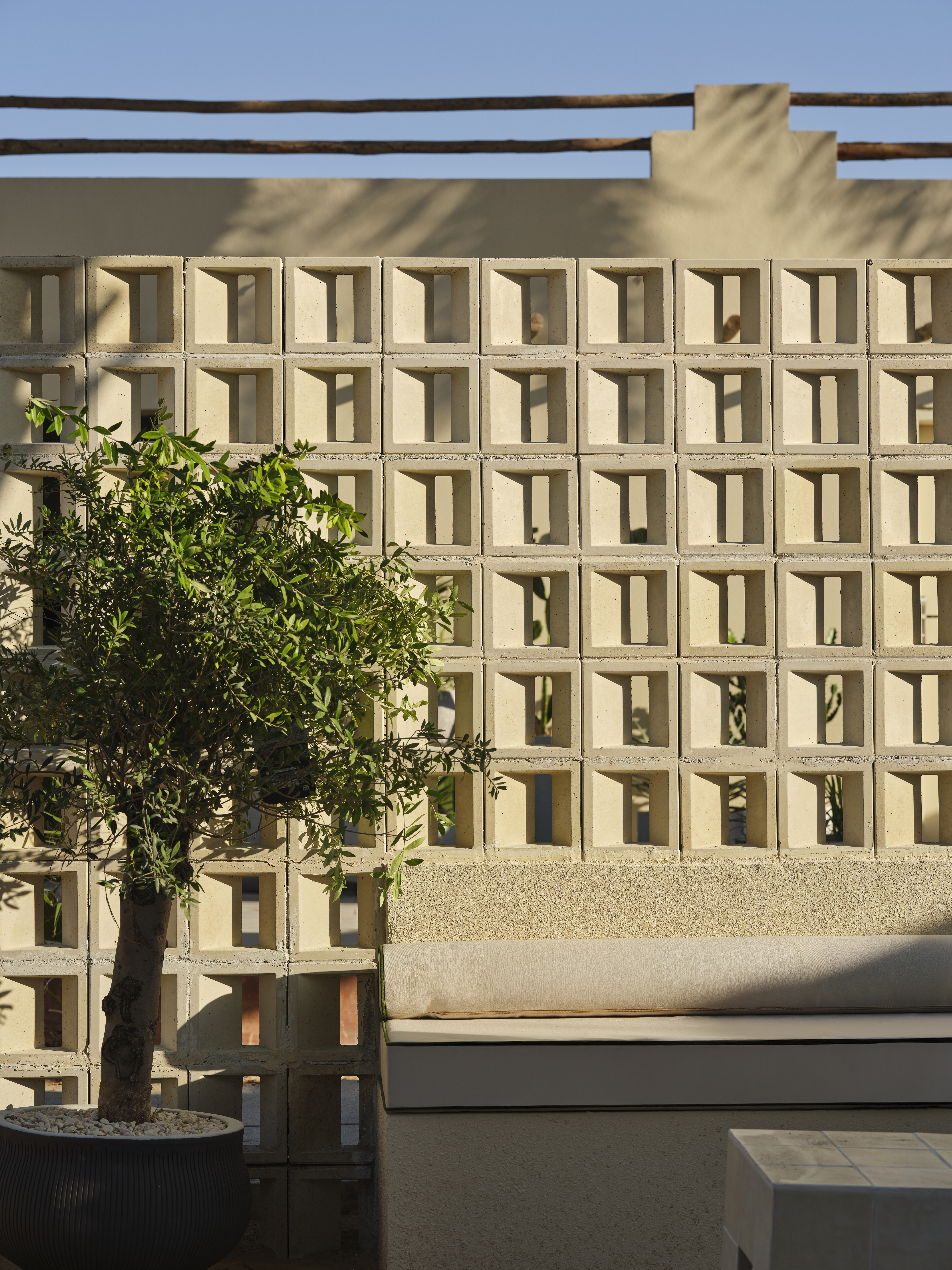 As light filters through the café throughout the day, the porous geometry of the blocks casts shifting shadows across floors and tabletops, quietly animating the interior without disrupting its sense of stillness. The blocks offer privacy and spatial definition without resorting to solid walls, promoting airflow and visual continuity in a climate where both are critical.