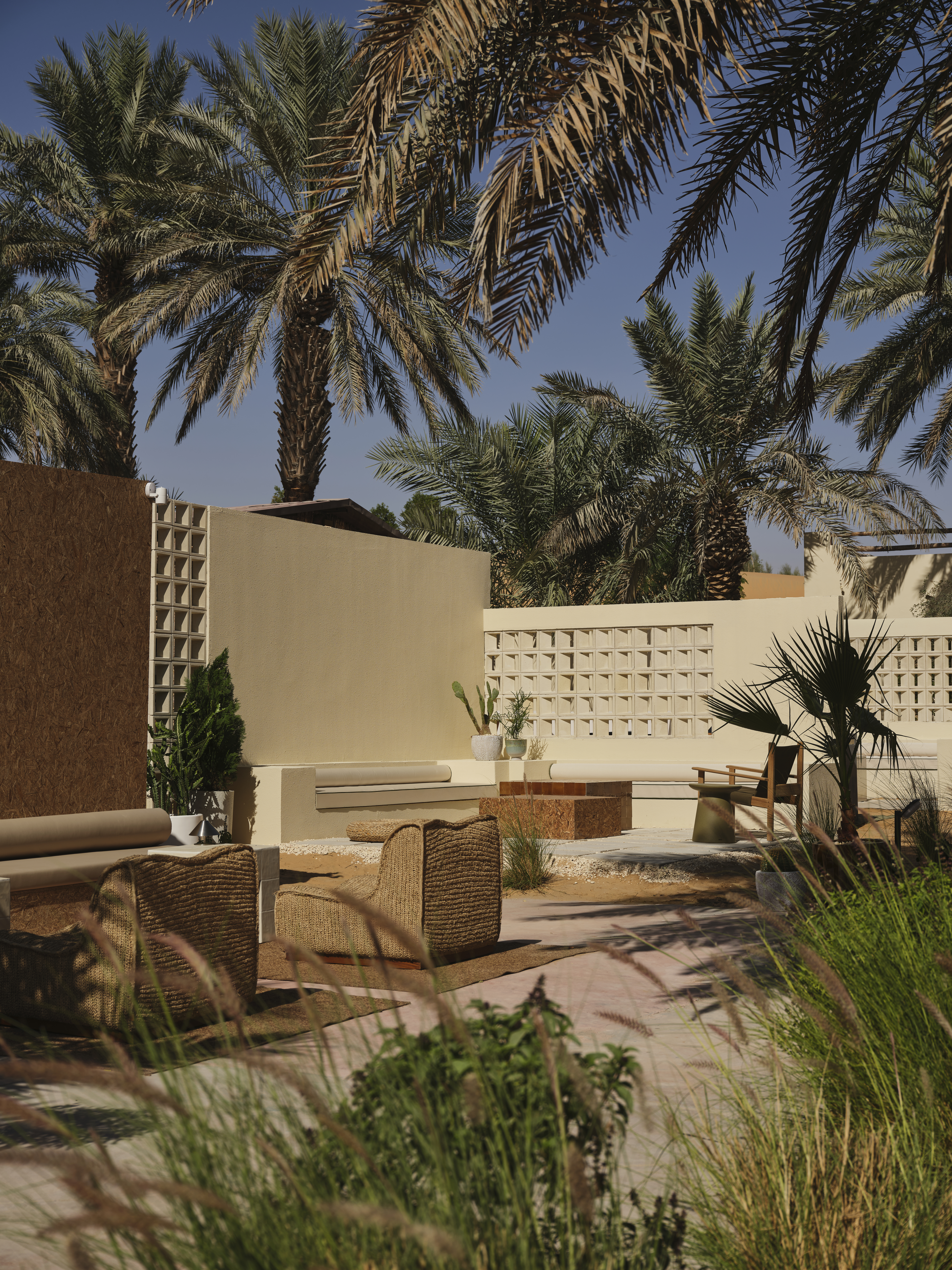 DuneBlocks by ARDH Collective were integrated throughout the project, shaping interior partitions, seating pockets and subtle transitions between zones. Their beige-sand pigment, achieved through the use of natural colourants, aligns the material with the tones of Al Ain’s desert and soft timber detailing, producing a cohesive visual language that feels both familiar and contemporary.